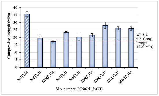 Figure 5 presents the 28-day CS of the NaOH-CRC. There is an overall reduction in strength with an increase in CR replacement. The CS ranges between 17.29 and 35.6 MPa. Hence, all the mixes can be used for structural applications based on the ACI 318 specification on structural concrete, as indicated by the red line in Figure 5. The control mix (M1), having 0% NaOH and 0% CR as expected, exhibited the highest CS value of 36.5 MPa. With the replacement of 5% and 10% untreated CR (M5 and M3), the CS dropped by 45% and 51% compared to the control, respectively. However, when 5% NaOH (M7) pretreated CR was used for the replacement, the strength loss recorded was 35%, 10% lower than the strength loss recorded for 5% untreated CR (M5), representing a 22% lower reduction. Similarly, using 10% replacement of 5% NaOH pretreated CR shows an increase in strength of 11% compared to using untreated CR at the same replacement level. When the pretreatment concentration increased to 10% NaOH, the rate of strength loss significantly reduced, as can be observed from M6 (10% NaOH and 5% CR) exhibiting the highest CS following the control (M1) with just a 21% loss. In the same vein, despite having a higher CR content, M4 (10% NaOH, 10% CR) has a higher CS value than M5 (0% NaOH, 5% CR), M7, and M9 (5% NaOH, 5% CR). Increases of 43% and 51% were recorded between mixes containing 5% and 10% untreated CR and those containing 5% and 10% CR pretreated with 10 NaOH, which is greater than the improvements reported (8–40%) in most literature utilizing the same amount of NaOH pretreated CR [28]. This is due to the higher NaOH concentration than in the other mixes. As per the trend, the NaOH pretreatment significantly improves the CS. Despite having the same CR content, mixes with more NaOH concentrations have higher CS.