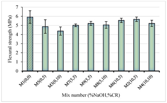 The flexural strength (FS) result obtained from the three-point test conducted on the NaOH-CRC is presented in Figure 7. Similar to the CS result, an increase in the CR replacement affects the FS negatively. This is in agreement with the findings of other researchers. However, the pretreatment reduces the strength loss with CR replacement. The mix having the highest FS (5.91 MPa) is the control (M1), having 0% NaOH and 0% CR. With 5% and 10% untreated CR replacements, the FS was reduced by 17.6% and 26%, respectively, compared with the control. However, when the 5% NaOH pretreated CR was used at 5% and 10% replacements, the strength loss reduced to 11.7% and 14.6%, respectively. As the NaOH pretreatment concentration increased to 10%, the strength loss reduced significantly to 4% and 11.7% for 5% and 10% CR replacement levels. This represents a 16.4% and 19.2% increase in the flexural strength between samples with untreated CR and those with 5% and 10% NaOH pretreated CR, respectively. This is in sharp contrast to Youssf et al. [27] who reported that there was no difference in the flexural strength between a concrete with untreated CR and that with NaOH pretreated CR. Also, the enhancement in the flexural strength is more than that obtained using other pretreatment methods such as coating with cement paste, which only enhanced the flexural strength by 2% to 7%, as reported by most literature [30]. The improved FS with increased NaOH pretreatment is attributed to better adhesion between the CR and the cement paste. The lack of proper bonding and the wide ITZ led to low-stress transfer noticed with untreated CR. However, with pretreatment, the CR surface became more hydrophilic, leading to better bonding with cement paste and other cement hydration products, thus reducing the thickness of the ITZ.