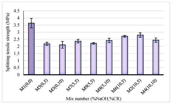Splitting tensile strength test entails exerting a diametric compressive load throughout a cylinder’s length until failure occurs. The tensile strength is then calculated from the failure load. The calculated tensile strength of the NaOH-CRC mixes is presented in Figure 8.