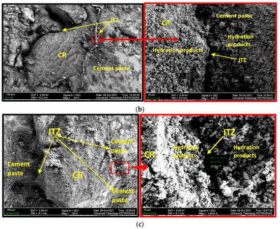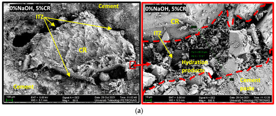 A FESEM investigation was carried out to assess the influence of the NaOH pretreatment on the CR and how it affects the concrete’s properties. Figure 11 shows the FESEM images of some of the samples. Figure 11a shows a mix (M5) containing untreated CR at 5% replacement level. As can be observed, the ITZ between the CR and the hardened cement paste is wide due to the poor bonding between the two. An enlarged image of the ITZ is shown on the right as an inset in Figure 11a. A closer look at the ITZ shows the surface of the CR without the presence of cement hydration products. On the contrary, many of the hydration products can be observed at the edge of the hardened cement paste. This agrees with the result of the mechanical properties of the rubberized concrete, where samples containing untreated CR have the lowest strengths because of the wide ITZ and lower stress transfer.