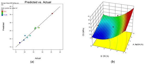 (a) Predicted vs. actual plot for compressive strength (CS). (b) 3D response surface diagram for CS.