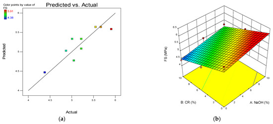 (a) Predicted vs. actual plot for flexural strength (FS). (b) 3D response surface diagram for FS.