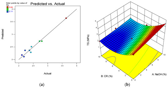 (a) Predicted vs. actual plot for tensile strength (TS). (b) 3D response surface diagram for TS.