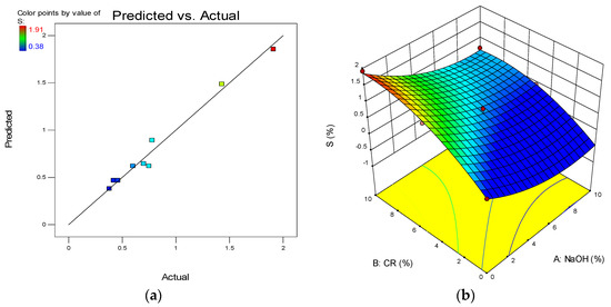 (a) Predicted vs. actual plot for S. (b) 3D response surface diagram for S.