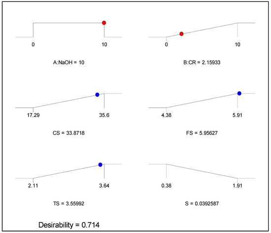 The optimization solution is presented in Figure 16 as ramps showing the optimal values of the input and output factors. The interpretation of the result is that by using 2% CR pretreated by 10% NaOH, a NaOH-CRC having CS, FE, TS, and S of 33.87%, 5.96%, 3.56%, and 4%, respectively as the maximum possible values, can be produced. Figure 17 depicts the desirability values of each variable and the overall desirability value of the multi-objective optimization. The desirability value of 71% indicates a good outcome considering the difficulty of the operation to strike a balance in obtaining optimal values without compromising any of the properties.