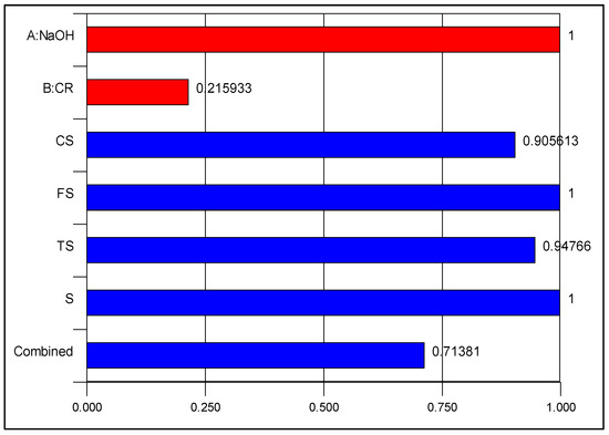The procedure begins with assigning the goal and importance to the input and output variables, followed by running the system and receiving the solutions as the optimal values of all the variables and the desirability index for the optimization. The desirability index gives the level of accuracy of the optimization process on a scale of 0 to 1 (0 to 100%). In this case, the optimization criteria are presented in Table 5. The goal is for the system to select between the lower and higher limits of the NaOH concentration (in range) while making the best use of (maximizing) the CR. As for the responses, the objective is to maximize all the mechanical strengths (CS, FS, and TS) while the drying shrinkage (S) should be minimized. Following the establishment of the objectives, the degree of importance for all variables was maintained at the default level of 3 (from a range of 1 to 5).