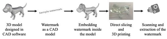 Over the years, the techniques of watermarking have kept evolving at a fast pace. Another notable work was published by Suzuki et al. [13]. They proposed a copyright method for protecting the authenticity of the 3D models manufactured using AM technologies. Their work mostly focused on preventing illicit copies of digital data from being sold to the public without the original owner’s permission. They emphasized the significance of digital data in the age of 3D printers by stating that digital data is the first step in the creation of a physical model using a 3D printer. Hence, it is the one that is of considerable value and should be protected. A watermark in the form of fine structures is embedded inside a 3D model and read out using a technique called thermography. This method [13], as compared with the previous methods [10,11,12], does not deal with embedding watermark using a mesh of 3D models. Unlike conventional watermarking schemes, it mostly requires a physical model at the end to ensure its authenticity. Instead of employing algorithms, a simple method of thermography is carried out using a heat scanner. It makes use of a key in the form of a binary code that can be supplied to the consumer by the creator. This process has certain drawbacks as the technique of thermography is an expensive and time-consuming process. Moreover, it requires small cavities to be formed inside the fabricated object which can affect different mechanical properties such as strength and strain of the object. This method can be further extended to different materials other than PLA and testing can be carried out to ensure that the mechanical properties are not affected. Moreover, this method can be further refined to make the watermarks more invisible.