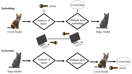 In the following year, Chao et al. [26] proposed a novel steganographic model for 3D models with high capacities. The schematic is represented in Figure 6. Their approach is based on a multi-layer embedding scheme which involves hiding messages inside the vertices of a 3D mesh. As mentioned earlier, the focus of steganography is to ensure higher data hiding capacity and invisibility than robustness. This work takes capacity, reliability and security into critical consideration and considers robustness as a trivial parameter. The embedding procedure takes place in two steps. A similar procedure is followed but in reverse at the extraction stage as well. The vertex embedding order is determined by using the same method mentioned in [23]. According to the performance of the approach, it has a higher embedding capacity than the approaches given in [23,24]. It has a data hiding capacity of 21–39 bits per vertex which is smaller as compared with the technique given in [25]. In terms of robustness, it is a bit weaker compared with other approaches [23,24,25], since it cannot withstand attacks such as cropping, simplification and smoothing. In terms of imperceptibility, the approach makes sure that there is no visible distortion between a stego and a cover model. The proposed approach has certain limitations. These are the usage of perfectly smooth spheres and small-sized models which cannot be utilized as cover models. Usage of PCA hinders the robustness of the method and the approach cannot defend itself against transformation attacks. There is a need to improve vertex transverse list and to check efficiency on 3D physical models.