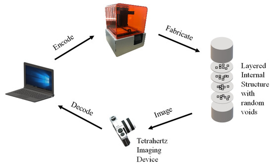 After the democratization of additive manufacturing, Willis et al. [32] proposed a technique of embedding material-based tags called infrastructs inside digitally fabricated parts using AM. A brief pipeline of the method followed in this work is shown in Figure 7. The procedure starts with encoding digital data on a computer. The user then specifies the region and to place the embedded tag. The tags were created for various purposes, such as location detection, object identification, object tracking and authentication. The depth and type of the embedded tag is decided and the model is fabricated on a 3D printer. They also proposed a technique of reading information using a Tetrahertz imaging system and the data is then decoded, respectively. These infrastructs were embedded inside the fabricated parts and were not visible to the naked eye. The algorithm works on the basic principle of the refractive index. The main limitation of this technology is that it is heavily dependent on the incident angle for the detection of signals, the depth of field is also narrow, and transmission is heavily dependent on the layer thickness. This technology can be further extended to materials other than ABS and various AM technologies. Mixing materials having different refractive indices may be proved to be useful in encoding and detecting large amounts of data.