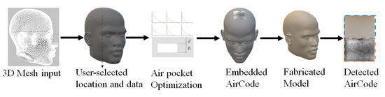 Li et al. [38] proposed an idea of embedding information in AM parts in the form of air tags. An air tag is composed of carefully designed pockets that are fabricated beneath the surface of the object during the fabrication process. Figure 8 represents the pipeline followed to encode air tag inside a fabricated object. The procedure starts with an input of a 3D mesh. The user specifies the region and the data to be embedded. The air pocket optimization is carried out and the program embeds the AirCode inside the digital model. The Information is encoded inside the air pockets in the form of markers and bits. The air pockets represent 1 while the filled solid part represent 0. The amount of information that can be stored inside the object using this technique can be at most 500 bits for a square tag of size 5 cm. Data are decoded using a light transmission source from a projector and the images are then captured using a monochrome camera. The results showed that decreasing the width can increase the amount of information stored but at the same time it makes the decoding process more difficult. Moreover, it assumes that material is homogeneous and semi-transparent, which might not be the same for all the materials. Lastly, air codes cannot be updated easily unlike the optical codes and hence, it cannot be replaced after the object is manufactured. Highly curved surfaces present challenges in embedding the air pockets as well. This method can further be extended to different areas of AM technologies and materials. Other computational methods may be used to determine the optimum depth of embedding and make the scanning process less time consuming.