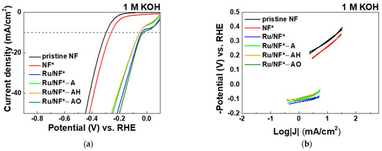 The LSV polarization curves of the pristine NF and NF* indicate overpotentials of 299 and 260 mV at 10 mA/cm2, respectively (Figure 5a and Table 2). The corresponding Tafel slopes are 147 and 161 mV/dec, as shown in Figure 5b. After depositing Ru, the overpotentials significantly decreased. The overpotential at 10 mA/cm2 further decreased from 36 to 25 mV with 95% Ar–5% O2 plasma treatment (sample Ru/NF*-AO). The Tafel slope of Ru/NF*-AO is 33 mV/dec. The HER kinetics follow the Volmer–Tafel mechanism [38,39].