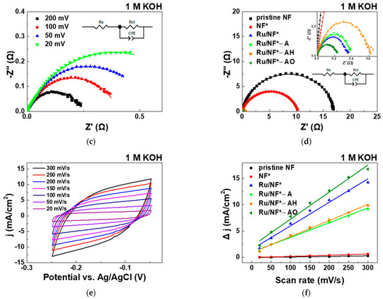 Figure 5d shows the Nyquist plots of pristine NF, NF*, Ru/NF*, Ru/NF*-A, Ru/NF*-AH, and Ru/NF*-AO catalysts in 1 M KOH at an overpotential of 200 mV vs. RHE; the inset shows magnified views of these plots. The Rct values for Ru/NF*, Ru/NF*-A, Ru/NF*-AH, and Ru/NF*-AO are 0.4, 0.4, 0.6, and 0.2 Ω, respectively; these are much lower than those of pristine NF (17.1 Ω at an overpotential of 200 mV) and NF* (10.3 Ω at an overpotential of 200 mV). This implies a low charge-transfer resistance and highly efficient electron transport in all Ru-coated NF samples. Furthermore, the Ru/NF*-AO catalyst shows the lowest Rct value, suggesting that the oxygen-containing plasma most significantly reduces the interfacial impedance.