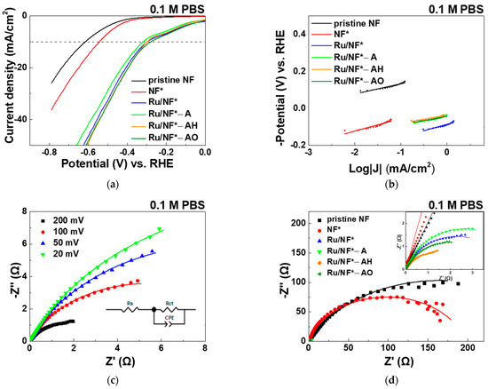 In 0.1 M PBS aqueous solution: (a) LSV polarization curves of pristine NF, NF*, Ru/NF*, Ru/NF*-A, Ru/NF*-AH, and Ru/NF*-AO toward HER. (b) Corresponding Tafel plots of HER. (c) Nyquist plots of the Ru/NF*-AO catalyst at four different applied overpotentials versus RHE. (d) Nyquist plots of pristine NF, NF*, Ru/NF*, Ru/NF*-A, Ru/NF*-AH, and Ru/NF*-AO catalysts at an overpotential of 200 mV versus RHE.