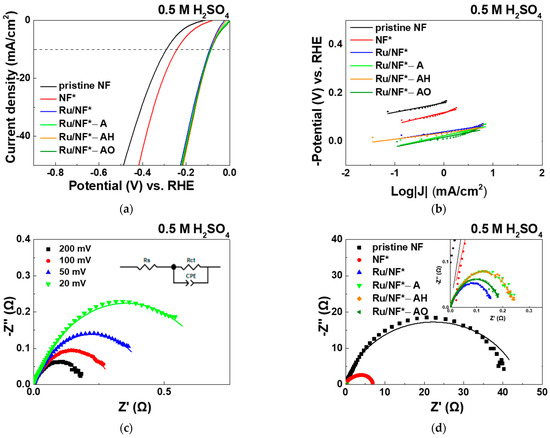 In 0.5 M H2SO4 aqueous solution: (a) LSV polarization curves of pristine NF, NF*, Ru/NF*, Ru/NF*-A, Ru/NF*-AH, and Ru/NF*-AO catalysts toward HER. (b) Corresponding Tafel plots of HER. (c) Nyquist plots of the Ru/NF*-AO catalyst at four different applied overpotentials versus RHE. (d) Nyquist plots of pristine NF, NF*, Ru/NF*, Ru/NF*-A, Ru/NF*-AH, and Ru/NF*-AO catalysts at an overpotential of 200 mV versus RHE.