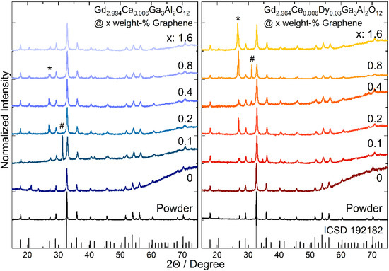 XRD patterns of Gd2.994Ce0.006Ga3Al2O12 and Gd2.964Ce0.006Dy0.03Ga3Al2O12 powders and ceramics with different graphene content (*—graphite, #—abrasive MgAl2O4).