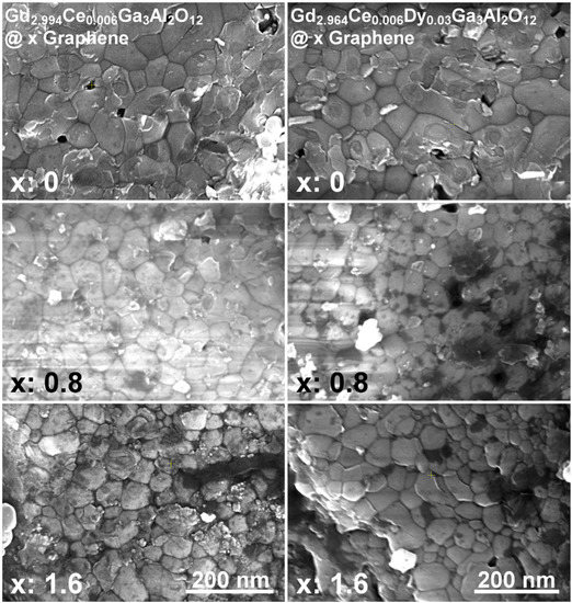 SEM images of Gd2.994Ce0.006Ga3Al2O12 and Gd2.964Ce0.006Dy0.03Ga3Al2O12 ceramics with different graphene content.
