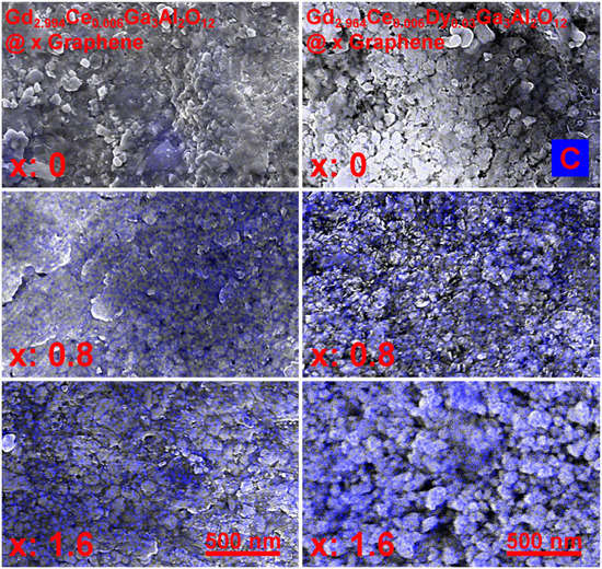 SEM + EDS maps indicating carbon (C) amount in the Gd2.994Ce0.006Ga3Al2O12 and Gd2.964Ce0.006Dy0.03Ga3Al2O12 ceramics with different graphene content.