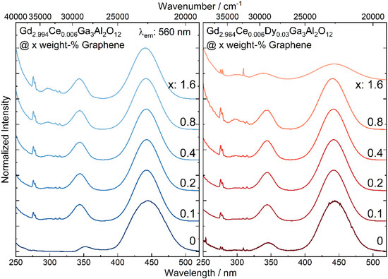 The excitation spectra of Gd2.994Ce0.006Ga3Al2O12 and Gd2.964Ce0.006Dy0.03Ga3Al2O12 ceramics with different graphene content.