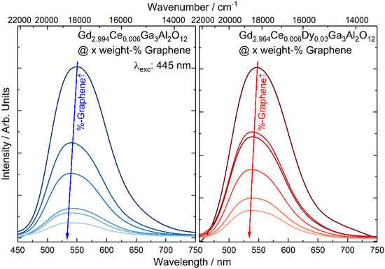 The emission spectra of the Gd2.994Ce0.006Ga3Al2O12 nanoceramics doped and co-doped with cerium and dysprosium ions were measured under 445 nm laser diode excitation (Figure 5). An intense broad band centered at 550 nm, associated with the transitions from the 5d1 level to the 2F5/2 ground state of Ce3+ [30] can be observed for all samples. One can notice that with an increase in the graphene content, the emission band is shifted toward a lower wavelength. The shift of the luminescence band is an effect of changes in the Ce3+ environment resulting from alternation of the type of coordination and bond length between the luminescent ion and surrounding ligands [31,32]. Herrmann et al. [33] showed that Ce3+ emission peak positions shift towards longer wavelengths while the Ce3+/Ce4+ ratio decreases. In the case of Gd2.994Ce0.006Ga3Al2O12 and Gd2.964Ce0.006Dy0.03Ga3Al2O12 nanoceramics the addition of a redox agent (carbon in form of graphene) may lead to a reduction in residual Ce4+ to Ce3+ and, as a result, a shift of the emission wavelength toward lower wavelengths. The decrease in the emission intensity is related to the dark gray color of the ceramics after the addition of graphene and their strong light absorption.