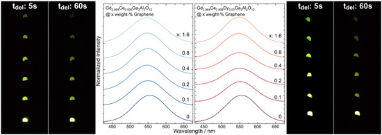 Persistent luminescence spectra of Gd2.994Ce0.006Ga3Al2O12 and Gd2.964Ce0.006Dy0.03Ga3Al2O12 ceramics were registered after ceasing 445 nm laser diode irradiation (Figure 6). The persistent luminescence spectra were analyzed and the results are presented in Table 2. On their basis, it was found that maximum intensity of persistent luminescence depends of the concentration of graphene. Similar to the conventional luminescence, after the addition of graphene, a blue shift of the spectrum maximum was observed with only two exceptions: Gd2.994Ce0.006Ga3Al2O12 with 0.2 weight-% and Gd2.964Ce0.006Dy0.03Ga3Al2O12 with 1.6 weight-% of graphene. The FWHM is changed depending on the sample composition. For garnets doped only with cerium the FWHM decreases compared to the ceramic without graphene addition but the changes are irregular. In the case of the ceramics co-doped with dysprosium, FWHM increased in comparison to the pure one and simultaneously decreased with the increase in the amount of graphene.
