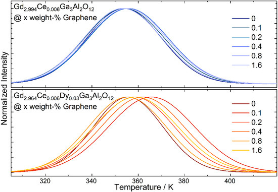 Normalized thermoluminescence (TL) glow curves registered for Gd2.994Ce0.006Ga3Al2O12 and Gd2.964Ce0.006Dy0.03Ga3Al2O12 ceramics with different graphene content.