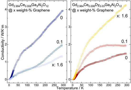 The impact of the graphene content in Gd2.994Ce0.006Ga3Al2O12 and Gd2.964Ce0.006Dy0.03Ga3Al2O12 ceramics on the thermal conductivity in the range from 2 K to 300 K was measured (Figure 9). For all investigated samples, the temperature dependence of thermal conductivity exhibited roughly the same character—disorder type, but with considerably higher values. The difference between particular ceramics: the Gd2.994Ce0.006Ga3Al2O12 and Gd2.964Ce0.006Dy0.03Ga3Al2O12 is clearly visible. The dysprosium addition to the ceramic structure lowers the thermal conductivity by two and a half, from almost 4 W/mK to 1.5 W/mK at room temperature. The reduction in the thermal conductivity value is caused by the increased number of scattering centers resulting from the higher amount of dopant in the structure. The higher the dopant amount, the lower the effective thermal conductivity value [37]. The mechanism changes when introducing into the material a substance of much higher thermal conductivity such as graphene in our case. The situation considered in this paper is twofold. For Gd2.994Ce0.006Ga3Al2O12, the addition of graphene lowers the thermal conductivity—implying that instead of improving the heat transfer in the structure graphene locates itself creating additional scattering sources. Just 0.1% of graphene reduced the heat transfer by half at room temperature, while the highest investigated graphene addition (1.6%) limits the thermal conductivity by three @RT. Below 140 K the difference between different graphene concentration on thermal conductivity is negligible. An entirely opposite process is observed for the Gd2.964Ce0.006Dy0.03Ga3Al2O12 sample. For the cerium/dysprosium co-doped case, adding the graphene enhances the heat flow as desired. Graphene acts here as a catalysator. The 0.1% graphene addition results in a third increase in thermal conductivity from 1.5 W/mK up to 2 W/mK at room temperature. The highest graphene addition (1.6%) lifts the thermal conductivity to 4.25 W/mK. The examined ceramics have demonstrated that improvement of heat flow cannot be straightforwardly achieved by just a graphene addition. The most important factor is the way that the graphene is incorporated into the matrix structure, and as a result, if it acts as a scatterer or carrier of heat.