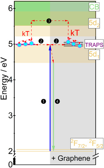 The mechanism of persistent luminescence is proposed by adopting the energy transfer diagram already described by us [32] supplemented with changes induced by the addition of graphene (Figure 10). The position of 5d-4f levels was determined from the spectroscopic measurements and the position of the traps from the TL spectra. The changes in the mechanism are mainly associated with the change of thermal conductivity and lanthanide ions oxidation state after graphene addition. The process of traps charging is started under 455 nm irradiation. The electrons are excited from the ground state to the 5d level (1). Then, part of the electrons immediately recombines in the form of a photon giving conventional yellowish luminescence. If near the luminescent center an energy trap (defect) is located, part of electrons may be transferred through a tunnelling process to them [38] (2). As Gd3Ga3Al2O12 matrix has relatively small activation energy [39] the remaining electrons are transferred to the conduction band (CB) and through it are transported to the traps (3). In the ceramics where graphene was added, the traps have broader distribution, what simplifies electrons catching and releasing. The discharging process is started just after ceasing irradiation. The electrons captured in the traps may be released in two ways. One is using the same tunneling process (2) and pumping excited states of nearest luminescent center. The second is a transfer of the electrons to the 5d level of Ce3+ through CB (4). As the energy of the traps is relatively small (below 1 eV), the captured electrons may already be released at room temperature and due to improved thermal conductivity and greater traps distribution, it is also easier to release electrons from deeper traps. When the charge carriers are released, they move back to the emission center and then to the ground state giving persistent luminescence (4). As the charge carriers are gradually released from trapping centers, the persistent luminescence may take up to tens of minutes.