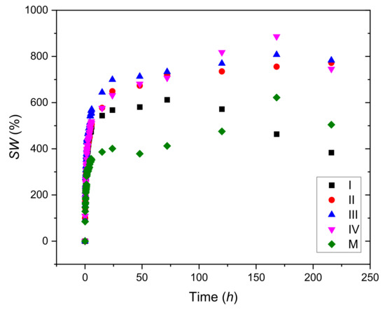 One can observe that CuSO4 has a favorable effect on the degree of swelling. The hydrogels crosslinked with CuSO4 × 5H2O demonstrate a higher hydration capacity than the control sample (M), due to cross-linking effect of copper ions. Sample III, the one with 0.86% CuSO4 × 5H2O, stands out clearly compared to the other samples, starting from the very first 10 min of swelling, keeping its trend throughout the testing period.