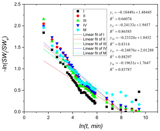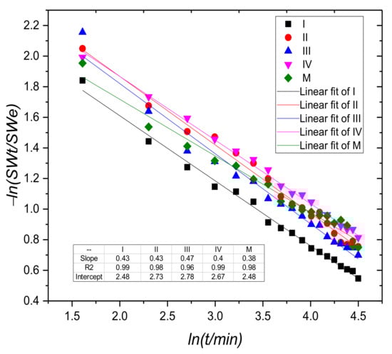 The plot of −ln (SWt/SWe) against ln(t) for samples containing copper and the control sample (M) for the whole swelling process.