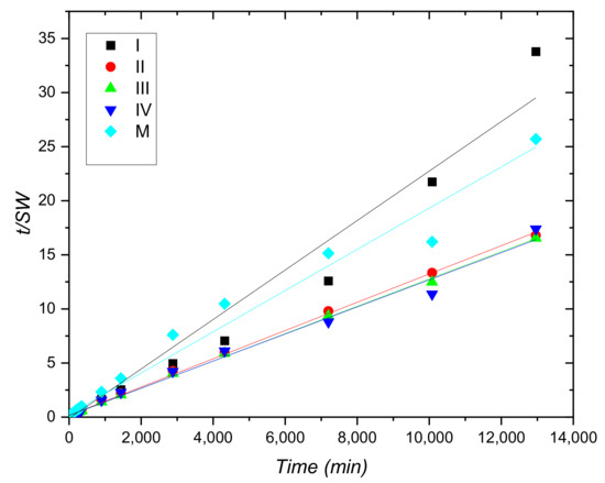 Representing Schott’s Equation (6), it can be observed in Figure 6, that, except for sample containing 0.39% copper sulphate, one can see a linear dependence between t/SW and t, demonstrating that the swelling process follows Schott’s equation for all swelling time.