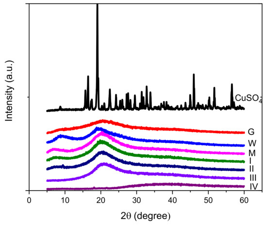 XRD patterns for copper sulphate, gelatin (G), whey powder (W), whey–gelatin hydrogel (M), and hydrogels containing copper sulphate (I, II, III, IV).