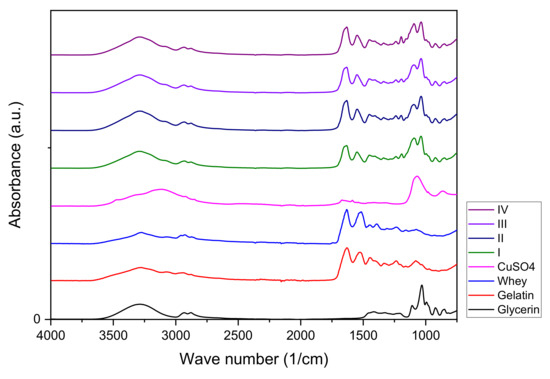 The spectroscopic analysis in the field of IR (400–4000 cm−1) makes a significant contribution to understanding the composition and structure of compounds in the food industry, especially their proteinaceous components [16,32,33]. The peptide bonds in the α-helical and β-sheet structures, the coil, and disorganized/random areas of the proteins can be estimated by analyzing the amide I bands (1600–1700 cm−1) that correspond with the secondary structure of proteins [34]. Nevertheless, the addition of certain chemical compounds (natural or synthetic polymers, cations, essential oils, plasticizers, or reinforcing agents) aims to improve the mechanical, physicochemical, and biological properties of whey hydrogels, which will contribute to the structural changes of proteins. This is because they show absorption peaks independent of the complexity of the composite hydrogel, causing shifts of absorption peaks to lower or higher wavenumbers or intensities, respectively, which will highlight possible new bonds formed in the structure of the hydrogel [33].