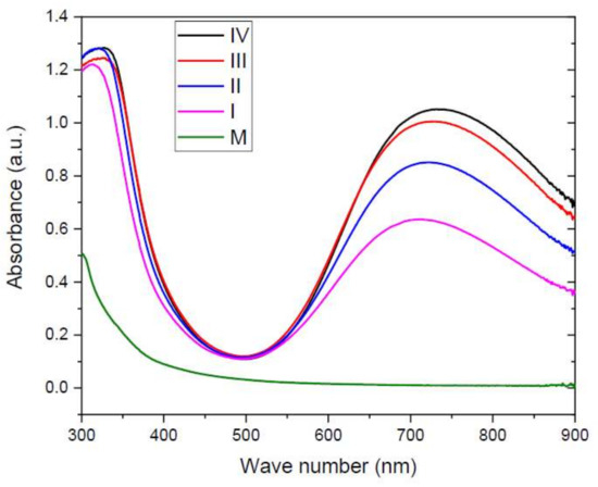 The addition of Cu determined the shift of the diffraction angle 2θ to higher values for diffraction peaks corresponding to helical structures, compared to sample M, revealing the increase in the interactions between chains, contributing to the decreasing of the diameter of the triple helix, and the distances between polypeptides chains. The increasing of the content of Cu for hydrogel samples determined major changes in the hydrogel structure leading to the decreasing of the crystallinity and destruction of helical structures, proved by the missing of the peak at 2θ ≈ 8° for samples III and IV. In the case of sample IV, the peak around 2θ ≈ 20° is missing, and a wide peak centered at 2θ ≈ 38° can be noticed. The diffraction peak at 2θ ≈ 36.91° is related to the distance between amino acid residues along the helix [52,53] exhibiting values of about 0.24 nm.