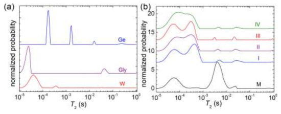 Porous media are largely characterized using a non-destructive method, such as nuclear magnetic resonance (NMR) relaxometry [34,35,36], a method that analyzes the molecular motions of water molecules inside the polymer matrix, in the millisecond range. Water plays an important role in hydrogels production, since it influences the mechanical and rheological characteristics of hydrogels, because of interactions between a fraction of water with the polymer chains; therefore, this method can describe the structural formation of hydrogels. Spin–spin 1H transverse relaxation times (T2) measurements using CPMG (Carr–Purcell–Meiboom–Gill) pulse sequence is commonly used as it is a rapid and robust method, while the longitudinal relaxation time (T1) measurements require more time [35].