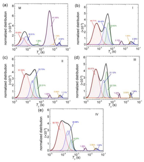 The deconvolution with six dynamics components of T2-distributions measured for (a) M; (b) I; (c) II; (d) III and (e) IV.