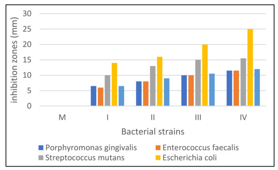 In the bacterial strain, Porphyromonas gingivalis an inhibition was observed in all samples tested with differences depending on the type of sample (6.5–11.5 mm). The lowest inhibition value was recorded in samples I (6.5 mm) and II (8 mm). In general, the inhibition of this bacterium was slightly lower compared to the other bacterial strains studied.