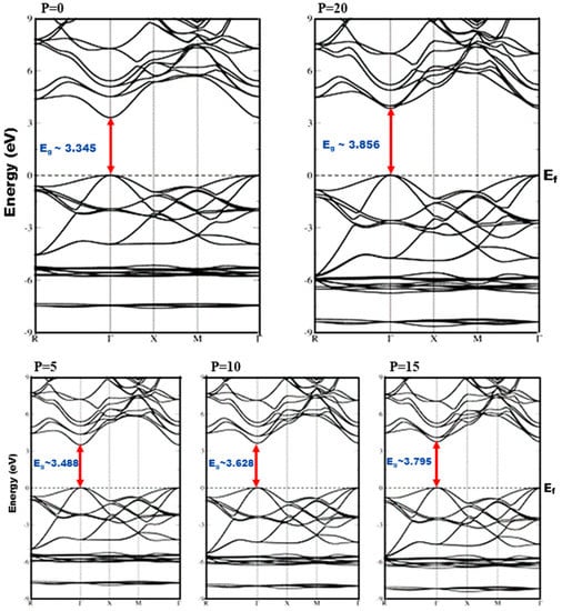 The pressure influence on band structures has been established by analyzing band structures in GGA, EV-GGA, and mBJ potentials at various pressures, whereas the pressure effect on the lattice constant is introduced by GGA and applied to band structures within EV-GGA and mBJ, respectively. GGA is widely recognized for underestimating the energy gap in self-consistent electronic band structure calculations using DFT [34], and to address this shortcoming, Engel and Vosko developed EV-GGA [35], a new functional formulation of GGA, which reproduces electronic bandgaps and yields better exchange potential in comparison to GGA. Therefore, we explored EV-GGA results along with GGA results and compared them to mBJ results; however, the results of these calculations indicate that the band structure’s overall features are identical, despite the difference in bandwidths. The band structure analysis demonstrates that this ternary alloy has a direct bandgap at all the considered pressures, and it is witnessed that the valence band maxima (VBM) and conduction band minima (CBM) are located at the same k-space point, thus this ternary alloy is a direct bandgap semiconductor, and the bandgap energy varies in the range of 3.35 eV to 3.86 eV within mBJ under the effect of pressure, as shown in Figure 1. The band structures calculated within different functionals (GGA, EV-GGA) are similar to mBJ; the only difference is in the band splitting value. As a result of the significant similarities between the band structures of EV-GGA and mBJ, the band structures of the mBJ functional are only shown in the cubic phase of crystal symmetry in Figure 2.