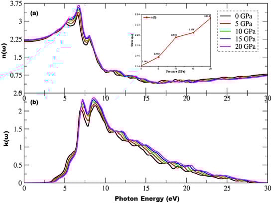 The optical properties of solids are frequency dependent, and as this material is cubic, the index of refraction is the same along the two transverse directions. Figure 7 depicts the index of refraction, , increasing with pressure alongside an increase in peak height from 3.25 to 3.68 units, and new peaks in the range of 3.53–8.04 eV of incident radiation are observed. As shown in the inset of Figure 7a, the pressure effect changes the static index of refraction, , from 2.140 to 2.233 units, and the static response of this material can be seen in the spectrum at 30 eV of incident photon energy. The maximum peak height also increases with pressure as the extinction coefficient rapidly increases due to threshold energies, as shown in Figure 7b. The main peaks in the extinction coefficient range from 2.02 to 2.15 and from 2.32 to 2.37 at 0 and 20 GPa pressure, respectively, and no spectra are observed for above 28.91 eV of radiation as this material does not interact with photons with energies greater than 28.91 eV, resulting in an ignorable absorptance spectrum. An overall increasing trend is observed in and under the pressure effect, with the active region corresponding to 3.16–15.09 eV of incident radiation.