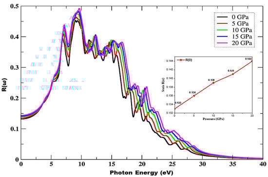 Figure 9 depicts a rapid increase in reflectance due to an increase in incident photon energy as well as in pressure and a shift of peaks towards higher values in combination with a wider spectrum, while peak height also increases under the influence of pressure. Dispersive reflectance humps are observed in the 11.26–26.94 eV range of incident radiation, and maximum reflectance is observed at 20 GPa, with 0.49 values at 9.59 eV. It can be witnessed from the inset of Figure 9 that the reflectance values increase as a function of pressure, and the static index of reflection is found to increase from 0.133 to 0.144 under the effect of pressure. New peaks are also observed in the 6.85–25.37 eV range of incident radiation.