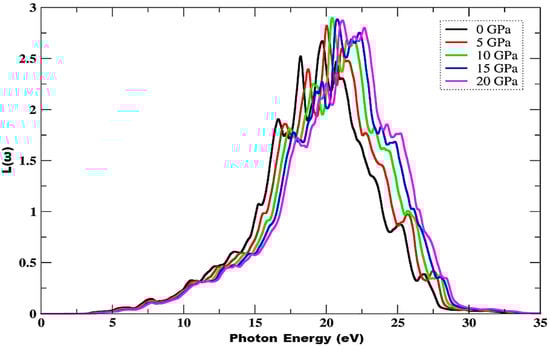 The energy loss function is zero below the bandgap energy of incident radiation, and it results in zero scattering of electrons. Above the bandgap energy, an inelastic scattering of electrons occurs, resulting in an energy loss spectrum that is directly proportional to the incident radiation. From Figure 10, it can be observed that the maximum energy loss function corresponds to a pressure of 10 GPa at 20.40 eV of incident radiation, having a value of 2.89 units, and it decreases with a further increase in pressure effect. Main peaks are observed in the 15.19–28.38 eV range, while the energy loss function is observed to be ignorable below threshold values and above 32.11 eV of incident photon energy. Moreover, the peak height is observed to be shifted towards higher values under the effect of pressure.