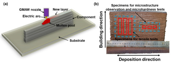 A low carbon low alloy Q345 steel plate with a thickness of 15 mm was used as substrate to fabricate the WAAM SMSS component. The surface of this steel substrate was first mechanically ground with 600-grit emery paper and then cleaned with ethanol. A gas metal arc welding machine (Panasonic 350, Tangshan, Hebei, China) was used for the WAAM fabricated process, and the detailed welding parameters are demonstrated in Table 1. Those suitable parameters were determined based on the lowest possible spattering and on perfect bead quality with the fewest surface imperfections. Self-manufactured SMSS solid wire that was 1.2 mm in diameter was chosen as the welded material. The nominal chemical composition in weight percent was presented in Table 2. To protect the melt pool from oxidation and ambient contamination, a gaseous combination of Ar (98%) and CO2 (2%) with a flow rate of 20 L/min was employed as the shielding gas. The dwell duration between adjacent weld track was fixed to 3 min to avoid heat accumulation. The set-up of WAAM process is schematically depicted in Figure 1. The wire extension was set to 10 mm and maintained at this level during the whole WAAM process. As shown in Figure 1a, the multi-layer wall was fabricated by back-and-forth paths, representing the deposition direction of any two adjacent tracks were opposite. Finally, a SMSS component with dimensions of 230 mm × 160 mm × 10 mm was constructed as shown in Figure 1b.