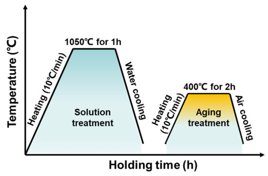 In order to eliminate the heterogeneity of the microstructure and undesired phases, the WAAM SMSS samples were post-treated with heat treatments. Detailed heating and cooling procedures for heat treatment are listed in Figure 2. The samples were first austenitized for 1 h at 1050 °C and then water quenched to ambient temperature. Subsequently, the quenched samples were aged for 2 h at 400 °C, followed by air cooling. In addition, a direct aging treatment at 400 °C for 2 h was conducted as a baseline for comparison purposes. For convenience, we designated the as-printed sample as AP, the solution + aging-treated sample as SA, and the direct-aging-treated sample as AT.