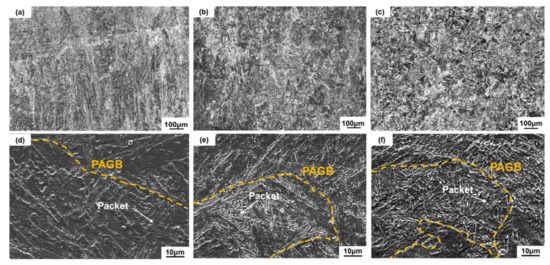 Micrographs of WAAM and post-manufactured heat treatment SMSS samples are shown in Figure 3. From the side view, the structure of AP and AT samples is characterized by a columnar microstructure oriented along the building direction (Figure 3a,b). The solidification morphology is mainly determined by the temperature gradient (G), solidification rate (R) and cooling rate (product of G and R) [24]. In general, it is known that the columnar grain is favored when the ratio of G/R is high [25]. Therefore, in the case of WAAM, the high G/R and the absence of nucleation events upstream of the solid/liquid interface led to the occurrence of columnar grains [3]. The phenomenon is similar to other WAAM processed materials [26]. Columnar characteristics are no longer visible following the solution + age treatment (Figure 3c). To gain a better understanding of the microstructural characteristics, SEM was used. As illustrated in Figure 3d, the microstructure of the AP sample shows fully martensitic structure. A prior austenite grain is made of several martensite packets with the same habit plane in the AP specimens. After post-manufactured heat treatment, SA as well as AT samples also exhibit a characteristically martensitic structure, as shown in Figure 3e,f. The SMSS component demonstrates a very good hardenability features [27]. SA and AT samples, on the other hand, display finer martensitic laths than the AP sample.