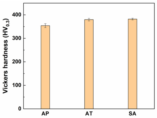 Vickers microhardness measurements were initially performed to determine the heat treatment-hardening response of the current SMSS component. The variation of Vickers hardness values for WAAM and post-manufactured heat treatment samples is presented in Figure 6. The AP sample with a martensite microstructure and a limited quantity of retained austenite has the lowest hardness value of 354 ± 8 HV0.3. After direct aging and solutionizing + aging heat treatments, the hardness values are improved to 379 ± 6 HV0.3 and 382 ± 4 HV0.3, respectively. The increase in hardness seen in AT and SA samples can be mainly associated with the refinement of grains and secondary precipitation during aging treatment [19]. The hardness value in SA samples is slightly larger than that in AT samples due to the increased volume proportion of austenite, as illustrated in Figure 5d and f, which results in matrix softening [38].