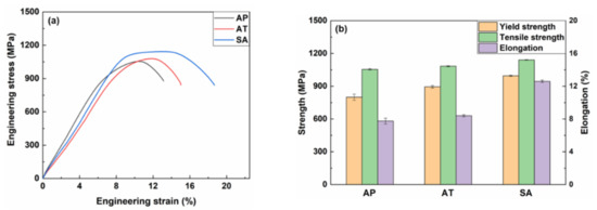 (a) Engineering stress-strain curves; and (b) the corresponding yield strength, tensile strength and elongation values of AP, AT and SA samples.