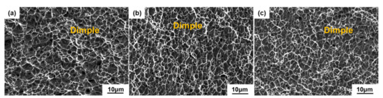 Figure 8 illustrates the fracture surfaces following a tensile test in order to better understand the tensile fracture mechanism. All of samples present a high density of dimples without microcracks scattered on the fracture surfaces and have failed through voids coalescence, which are obvious features of ductile fracture. In addition, it can be observed that the dimples become more irregular in size at the AP sample compared to the AT and SA samples. The linear intercept approach was used to determine the diameters of dimples. The size distributions of dimples in all samples are shown in Figure 9, which indicate that the mean diameters of dimples in AP, AT and SA samples are 1.19 ± 1.11 μm, 1.23 ± 0.96 μm and 1.33 ± 0.83 μm, respectively. Among them, the SA sample exhibits a more homogeneous distribution and bigger mean dimple size. The primary reason may be related to the fact of fine microstructure in SA sample; consequently, the slip was prominent during deformation, leading to the formation of large dimples [42]. It is indicated by many studies that tensile ductility increases as dimple size grows size [43]. Therefore, larger dimples on the fracture surface result in the increase in elongation for SA sample. Additionally, it is widely known that the occurrence of ductile fracture contains three distinct events, namely, void nucleation, and growth and coalescence to form a crack, followed by final fracture [44]. Typically, prior austenite grain boundaries, martensite grain boundaries, and precipitates serve as nucleation sites for the voids. As a result, the finer the effective grain size in the SA sample, as illustrated in Figure 5e, the more nucleation sites for voids [45]. During the deformation, the subsequent void coalescence consumes more energy, leading to increased ductility [46].