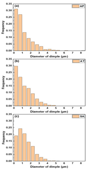 Dimple size distribution of tensile fracture at (a) AP, (b) AT and (c) SA samples.