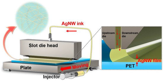 Silver-based materials have been important in the scientific field in recent years [16,17]. As reported, silver nanowires (AgNW) are considered to be a favorable material to replace ITO because of their high conductivity, high transparency, suitability for printing, and flexibility [15,18,19]. At present, AgNW-based TCFs can be fabricated through conventional preparation techniques, such as vacuum filtration [20], spin-coating [21,22], drop coating [23], spray-coating [24], Mayer rod coating [25,26], and screen printing [27,28]. However, these conventional preparation methods are difficult when taking into account the conductivity and transmittance of AgNW-based TCFs simultaneously, and it is also difficult to achieve large-scale preparation of TCFs, which limits the application of AgNW-based TCFs. In recent years, slot-die coating has rapidly developed in the preparation of thin films owing to its fast coating speed, high precision, and uniform wet thickness. Slot-die coating can achieve precise preparation of film by extruding and ejecting coating liquid along the gap of the coating die under a certain pressure and flow rate which is transferred to the substrate [29]. Little research on the slot-die coating preparation of AgNW-based TCFs is reported in the present literature.