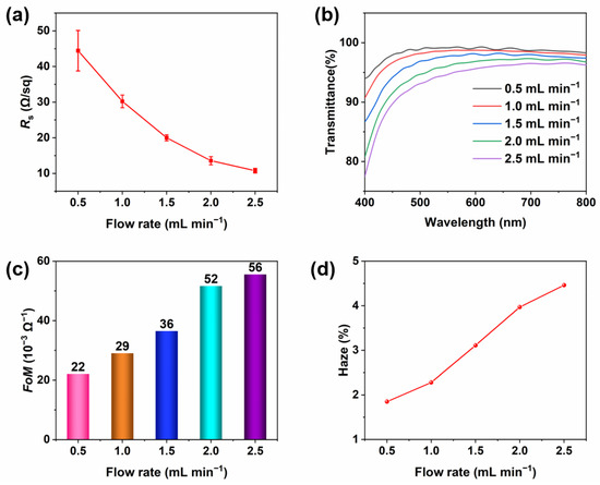 Optoelectronic properties of the AgNW film produced at different flow rates: (a) the Rs of the AgNW films; (b) the transmittance of the AgNW films from 400 nm to 800 nm; (c) the FoM; (d) the haze values of the AgNW films.
