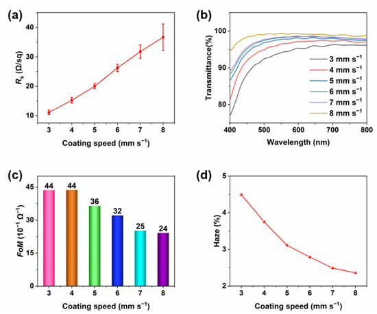 Optoelectronic properties of the AgNW film produced at different coating speeds: (a) the Rs of the AgNW films; (b) the transmittance of the AgNW films from 400 nm to 800 nm; (c) the FoM; (d) the haze values of the AgNW films.